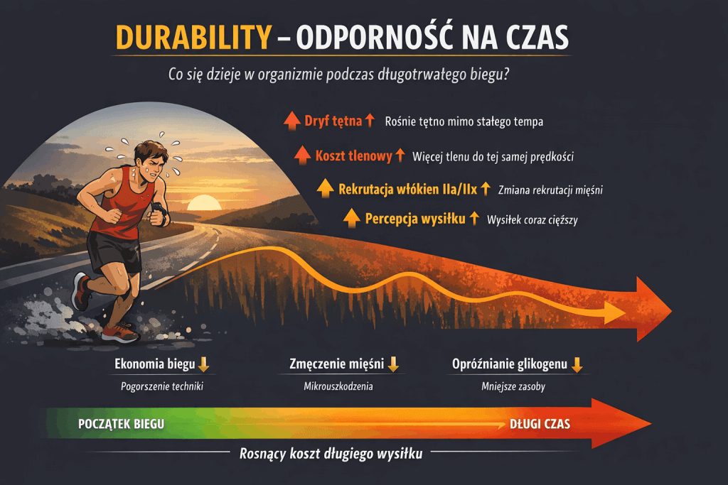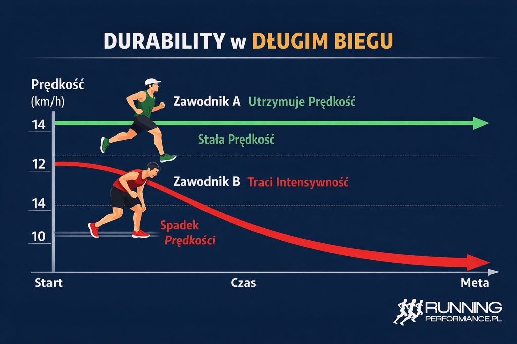 Durability nie jest więc zdolnością biegania szybciej. Jest zdolnością niepogarszania się, gdy wysiłek trwa dalej.