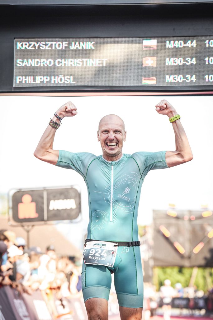 Warto podkreślić, że w całym cyklu przygotowań do IM ani razu nie przejechałem więcej niż 160 km na rowerze (zrobiłem to jeden raz). Nigdy nie przepłynąłem więcej niż 3 km na jednym treningu i nie przebiegłem więcej niż 30 km (też zrobiłem to tylko raz), oczywiście mam za soba kilka maratonów w przeszłości. W Thun — na jednej z najbardziej wymagających tras IRONMAN — zrobiłem 3,8 km pływania tempem 2:10/100 m, pojechałem 180 km rowerem z 2100 m przewyższenia w 5:54 (średnia 30,2 km/h), a maraton pobiegłem w 3:15 (średnia 4:37/km)