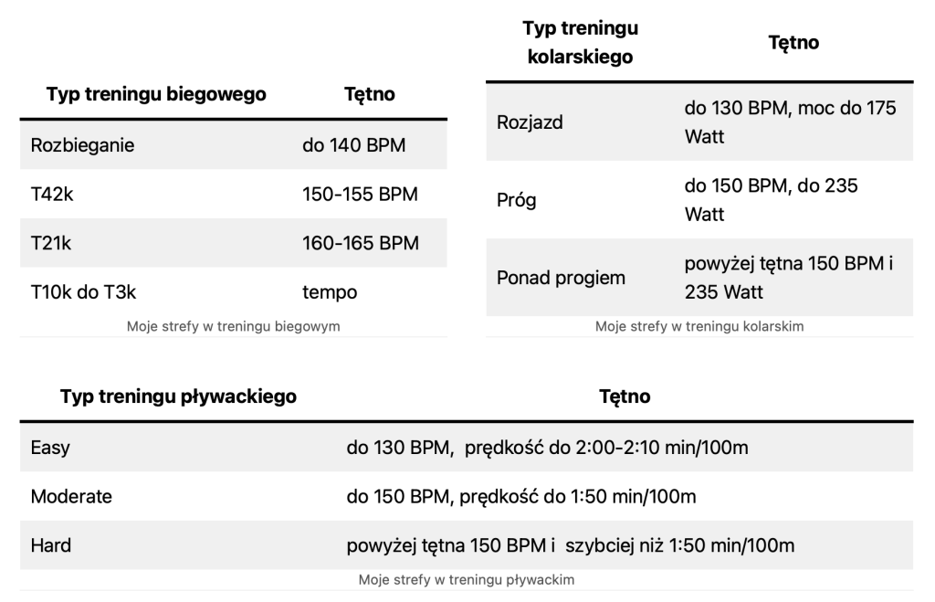 Poniżej strefy treningowe w poszczególnych dyscyplinach: